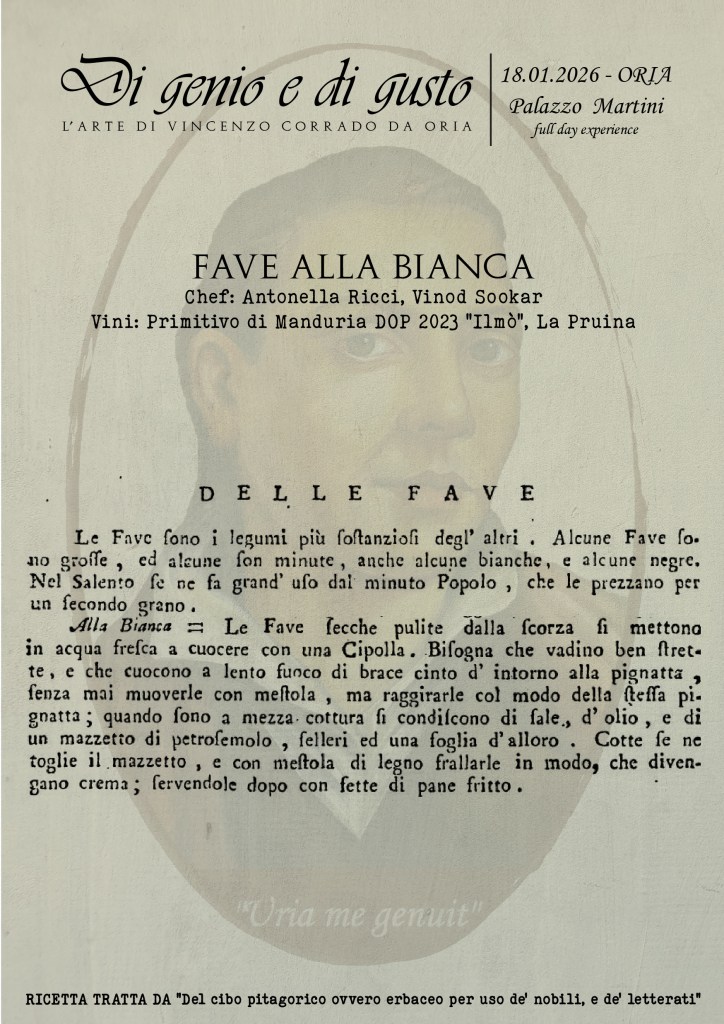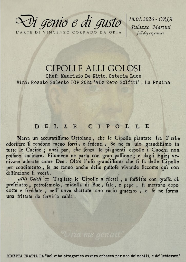 DI GENIO E DI GUSTO: L’ARTE DI VINCENZO CORRADO è un’iniziativa nata nel 2018 e che prosegue anno dopo anno. L’edizione del 2026 si svolgerà proprio il 18 gennaio, giorno in cui il Corrado fu battezzato (e probabilmente nacque, ma non ci sono atti di nascita da poter consultare), e 72024 vuole celebrarlo organizzando un full day esperienziale dedicato a stampa, storici e operatori turistici.